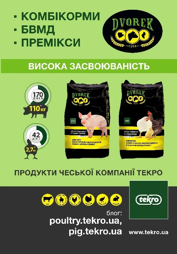 Лінійка продуктів під ТМ Dvorek- спеціально розроблена для потреб своїх клієнтів компанією Текро. Чеська компанія ТЕкро заснована в 1991 році і на сьогоднішній день є провідною компанією України та лідером ринку Чехії та Словаччини з виробництва вітамінно-мінеральних сумішей, концентратів, преміксів та готових кормів.